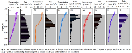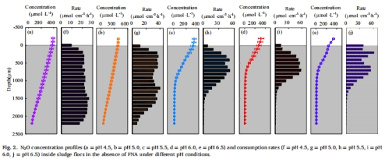 有FNA時N?O生成速率 圖5f–j FNA存在進一步刺激生成速率(pH4.5時比無FNA高8.4%),增加底物效應。