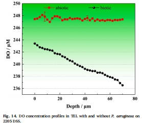 TEL溶解氧剖面 圖14(Unisense微電極) 核心意義:直接量化生物膜耗氧梯度(頂部242.3 μM → 底部236.5 μM),揭示局部缺氧促進點蝕。