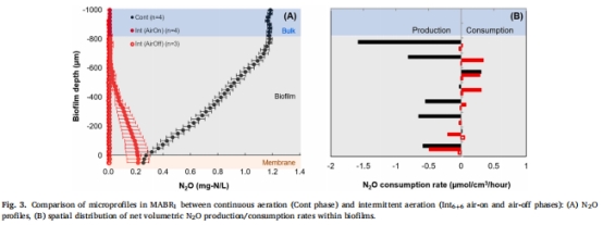 液相N?O:生物膜內濃度從0.74 mg-N/L降至0.08 mg-N/L(圖3A)。