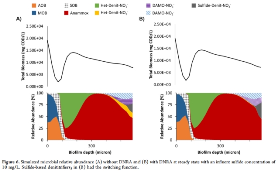 生物膜模型構建:基于AQUASIM平臺建立1D模型,模擬硫化物對氮/硫循環的調控機制(圖3,5)。