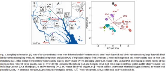 樣本采集:在珠江三角洲10條水質(zhì)等級不同的河流采集沉積物(圖1A),按水質(zhì)指數(shù)(WQI)分為III、IV_V、r_VI(修復(fù)后VI類)、VI四組。