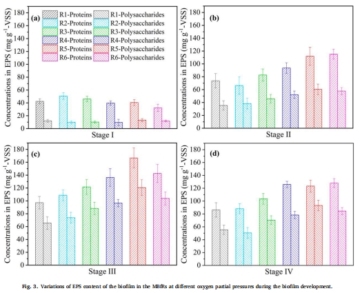 蛋白質和多糖含量隨氧分壓升高而增加(R5: 蛋白45.2 mg/gVSS,多糖38.7 mg/gVSS)。