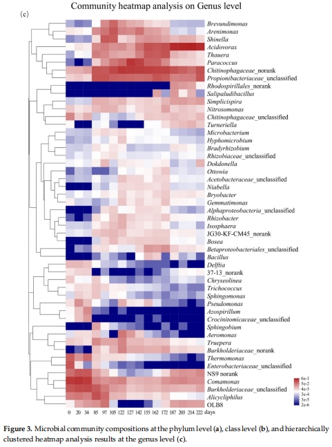 異養硝化菌(Acidovorax, Paracoccus等)相對豐度從16.2%(階段I)升至55.5%(階段IV)(圖3c)。