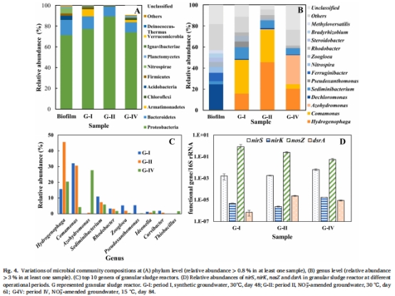 本研究成功開發(fā)了氫營養(yǎng)反硝化(HD)顆粒污泥工藝,在30°C下實現(xiàn)最高氮去除速率(NRR)0.42±0.04 kgN/(m3·d)(圖2),顯著高于固定床生物膜反應器(0.13±0.01 kgN/(m3·d))。顆粒污泥在低溫(15°C)和地下水處理中表現(xiàn)穩(wěn)定,亞硝酸鹽(NO??)和氧化亞氮(N?O)積累極低(圖3)。微生物群落以Hydrogenophaga和Comamonas為主(圖4),地下水中的硫酸鹽(SO?2?)促進了硫酸鹽還原菌(如Desulfovibrio)的生長。研究證實HD顆粒污泥工藝是處理低硝酸鹽(NO??)污染地下水的可靠技術。