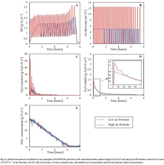 間歇曝氣實(shí)驗(yàn):通過(guò)ON/OFF控制(DO閾值1–2 g O?/m3)驗(yàn)證減排效果(圖6)。