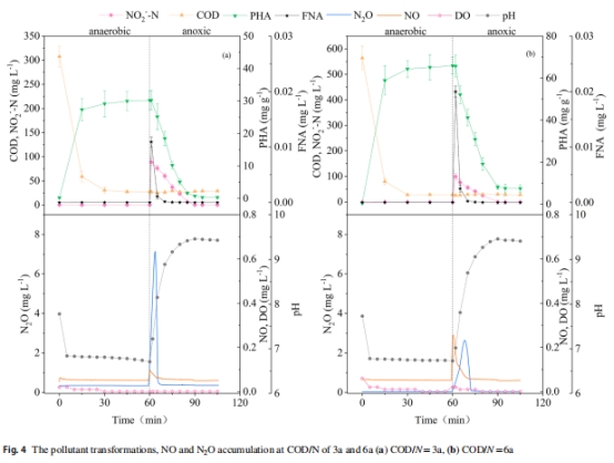 N?O積累機制:高FNA和NO抑制N?O還原酶(Nos),導致N?O積累(COD/N=6時N?O排放因子達3.50%)。