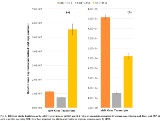 SRT=3.0天時nirS/nirK轉錄量最低(較其他SRT低1-2個數量級)。