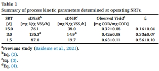 動力學限制機制:短SRT(1.5天)導致NO??積累(NRR=60±10%),長SRT(15.0天)促進完全反硝化(N?O積累達1.5 mg/L);SRT=3.0天時,反硝化速率(sDNaR=135.3 mg-N/g-VSS/h)最高而亞硝酸鹽還原速率(sDNiR=14.9 mg-N/g-VSS/h)最低(表1)。