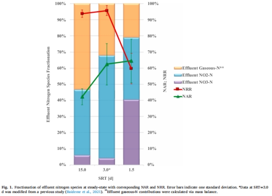 SRT=3.0天時,NAR(亞硝酸鹽積累率)最高(62±13%),NRR(硝酸鹽去除率)達96±3%。