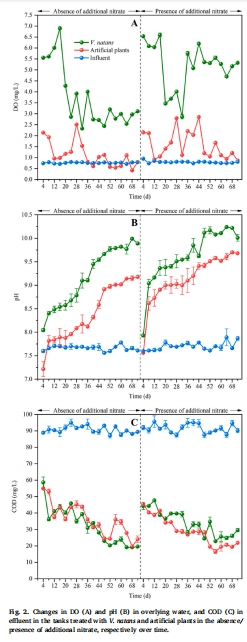 數(shù)據(jù):苦草使DO從1.1 mg/L(AP組)升至5.2 mg/L(VNN組),pH從7.66升至10.01。