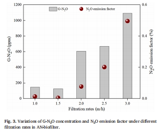濾速對N?O的影響:N?O產量隨濾速增加顯著上升,排放因子從1.5 m/h時的0.004%升至3.0 m/h時的0.496%(圖3)。