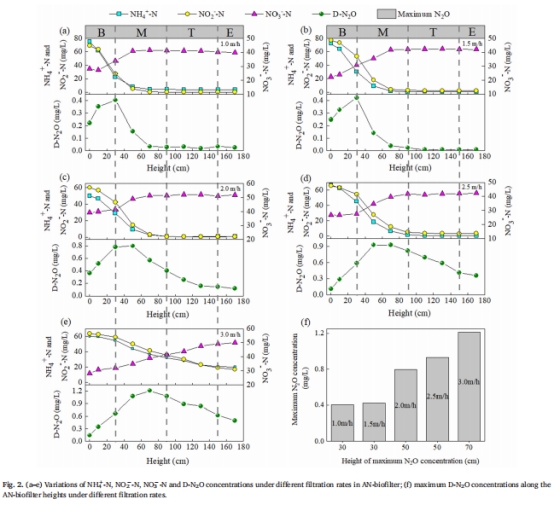 在厭氧氨氧化生物濾池(AN-biofilter)中設置濾速梯度(1.0–3.0 m/h),監測沿濾柱高度的氮形態變化及N?O濃度(圖2a-e)。
