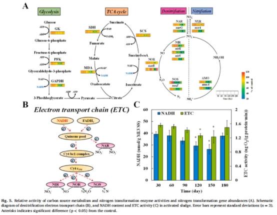 分子機制:nano-TiO?抑制碳源代謝(GAPDH、MDA酶活性↓)、電子傳遞鏈(ETC活性↓)及反硝化酶(NOS活性↓),導致電子競爭失衡(圖5)。