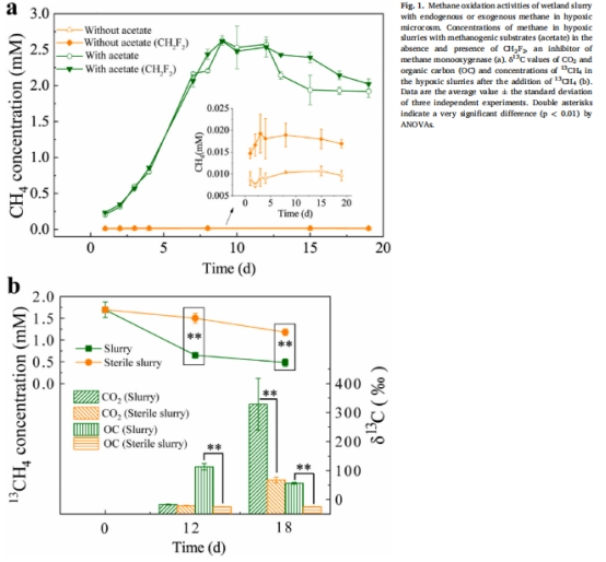 缺氧甲烷氧化:濕地土壤在溶解氧(DO)<20 μM條件下仍能氧化甲烷(圖1),13C同位素示蹤證實(shí)甲烷碳向CO?和有機(jī)碳轉(zhuǎn)化(圖1b)。