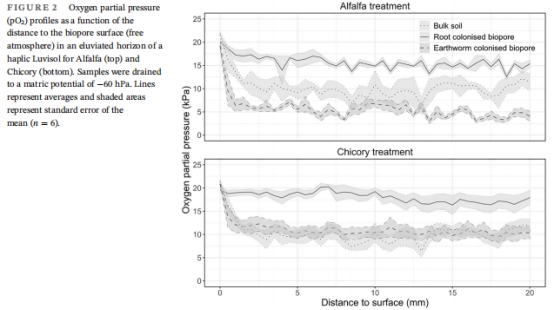 通氣增強效應:生物孔(根或蚯蚓形成)周圍土壤的氧氣濃度(pO?)和相對擴散系數(Ds/D?)顯著高于非生物孔區域(圖2-3)。