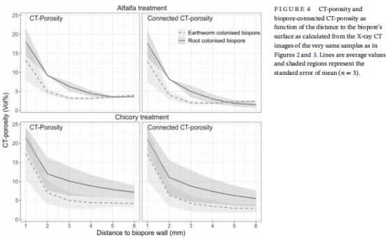 德國Luvisol土壤45-60 cm深層取樣(黏土質壤土),選取苜蓿(alfalfa)和菊苣(chicory)根系形成的生物孔及蚯蚓孔。