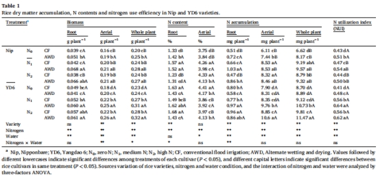 AWD使水稻生物量提升12-18%,NUI增加15-22%(N1水平最顯著)。