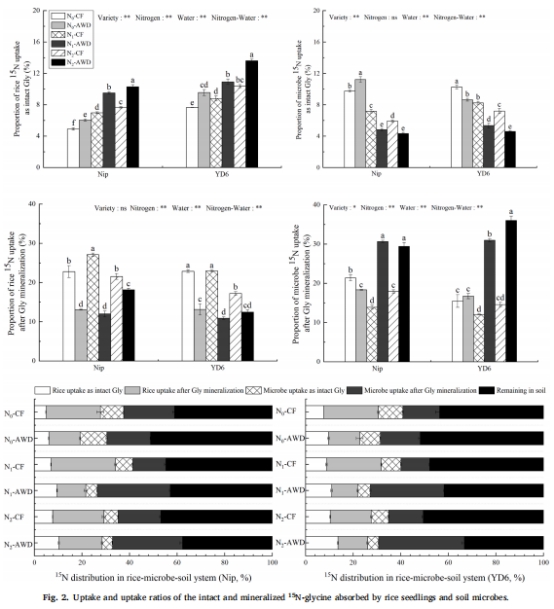 有機(jī)氮競爭格局:4.9-13.6%的外源甘氨酸被水稻直接吸收,4.4-11.2%被微生物同化;水稻與微生物對ON的競爭強(qiáng)度受氮肥水平調(diào)控(圖2)。