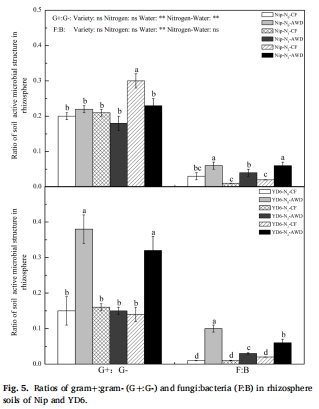 微生物群落響應(yīng):AWD增加根際革蘭氏陰性菌和真菌豐度,提高真菌:細(xì)菌(F:B)比值(圖4-5),增強(qiáng)土壤有機(jī)質(zhì)礦化能力。
