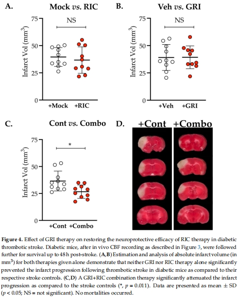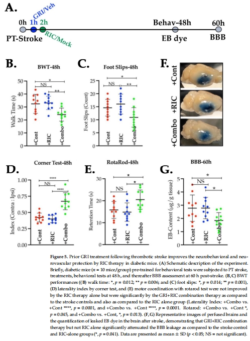 單獨使用RIC或GRI在糖尿病卒中模型中均無效(圖3-4),但 GRI預處理后聯合RIC 顯著提升腦血流(CBF)(圖3C)、減少梗死體積(圖4C)并改善神經功能(圖5)。