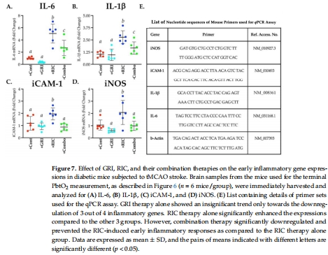 RIC單藥 意外升高炎癥因子(IL-6、iNOS等),而GRI+RIC聯合顯著抑制(圖7)。