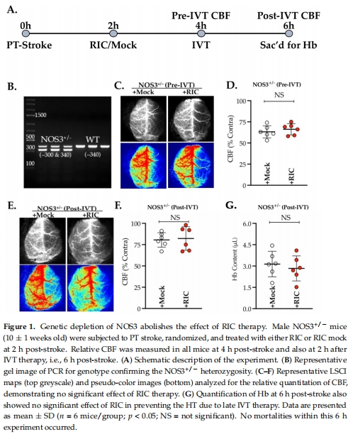 NOS3+/-小鼠中,RIC未能改善CBF(圖1B-C)或減少溶栓后出血(圖1F)。