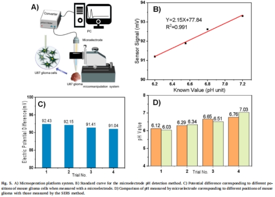 微電極數(shù)據(jù)重現(xiàn)了腫瘤的酸性梯度特征(中心pH 6.2→邊界7.4),從電化學(xué)角度獨(dú)立證實(shí)糖酵解代謝導(dǎo)致的酸化是膠質(zhì)瘤的穩(wěn)定標(biāo)志,強(qiáng)化SERS策略的生物學(xué)基礎(chǔ)。