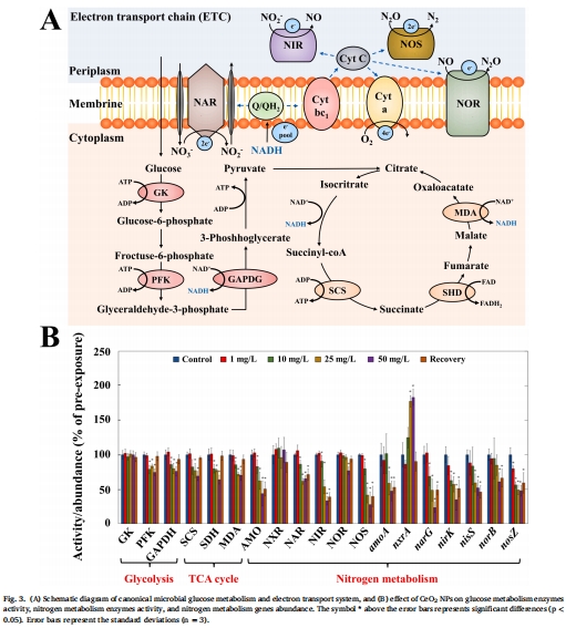 機(jī)制核心:NPs抑制NOS活性(Fig. 3B)和反硝化菌(如Flavobacterium)代謝,通過干擾電子傳遞(ETS活性下降)和酶功能。