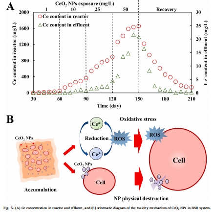 接種活性污泥,在穩(wěn)定BNR性能后,分階段添加CeO? NPs(0、1、10、25、50 mg/L),暴露周期151天(Fig. 1)。