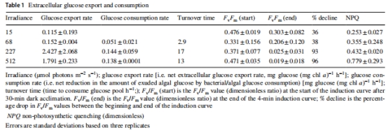 葡萄糖分泌與光抑制現(xiàn)象正相關(guān)(F?/F?下降93–96%,NPQ上升)(表1),表明過量光照導(dǎo)致碳溢出。