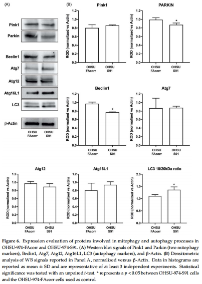 線粒體動(dòng)力學(xué)失衡:突變細(xì)胞中線粒體分裂蛋白DRP1表達(dá)升高(圖5),融合-分裂失衡,線粒體自噬(PINK1/PARKIN通路)和自噬(Beclin1/LC3)功能受損(圖6)。