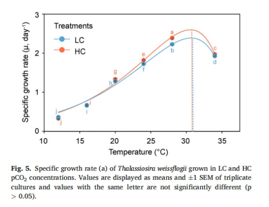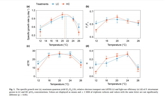 1. 溫度依賴性響應(yīng):海洋酸化(高CO?)對(duì)硅藻生長(zhǎng)的促進(jìn)作用在最佳溫度時(shí)最顯著(如 P. tricornutum 在20°C時(shí)生長(zhǎng)率增加8.9%),但隨溫度偏離最佳點(diǎn)(升高或降低)而減弱或轉(zhuǎn)為抑制(如26°C時(shí)生長(zhǎng)率降低31%)。這一模式在溫帶種(P. tricornutum)和熱帶種(T. weissflogii)中均成立(圖1a, 5)。