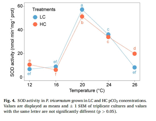 數(shù)據(jù)意義:高CO?在12°C和26°C顯著增加SOD活性(p<0.01),但在20°C降低。意義在于證實(shí)高低溫下酸化加劇氧化應(yīng)激,細(xì)胞需增強(qiáng)抗氧化防御以修復(fù)損傷。