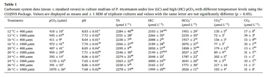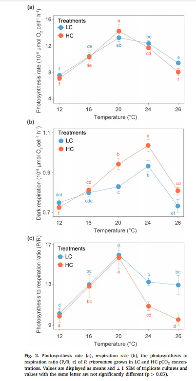 數(shù)據(jù)意義:高CO?在20°C降低POC(32.2%)和PON(45.3%),但在12°C、24°C和26°C時(shí)增加POC和PON(如26°C時(shí)PON顯著上升)。PON/POC比在高溫下升高。意義在于反映偏離最佳溫度時(shí),細(xì)胞需合成更多氮富集蛋白(如修復(fù)酶),以應(yīng)對(duì)酸化疊加脅迫。