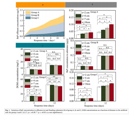 數(shù)據(jù)意義:圖1a顯示C組(根分泌物+微生物)的BaP去除率最高(285.93 ng/m2/day),表明協(xié)同作用增強(qiáng)凈化能力;圖1b顯示根分泌物輸入?yún)^(qū)(2cm)BaP積累降低(C組98.10 ng/g vs. B組193.41 ng/g),證明根分泌物提升底物凈化效率。數(shù)據(jù)量化了根分泌物對(duì)BaP源匯平衡的調(diào)控,為濕地設(shè)計(jì)優(yōu)化(如植物選擇)提供依據(jù)。