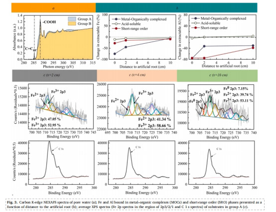 數(shù)據(jù)意義:圖3c顯示根分泌物輸入?yún)^(qū)C/(C+Fe)摩爾比增至0.92(vs. 非輸入?yún)^(qū)0.80),證明根分泌物改變礦物表面組成,抑制Fe-BaP穩(wěn)定結(jié)構(gòu)的形成。這支持了解放礦物結(jié)合途徑的假說(shuō),為濕地礦物-污染物交互模型提供數(shù)據(jù)。