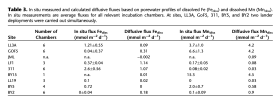 ? 原位測量孔隙水擴散通量(表3)與實測底棲通量差異顯著(如311站Fe擴散通量1.07 vs 實測2.6 mmol/m2/d)