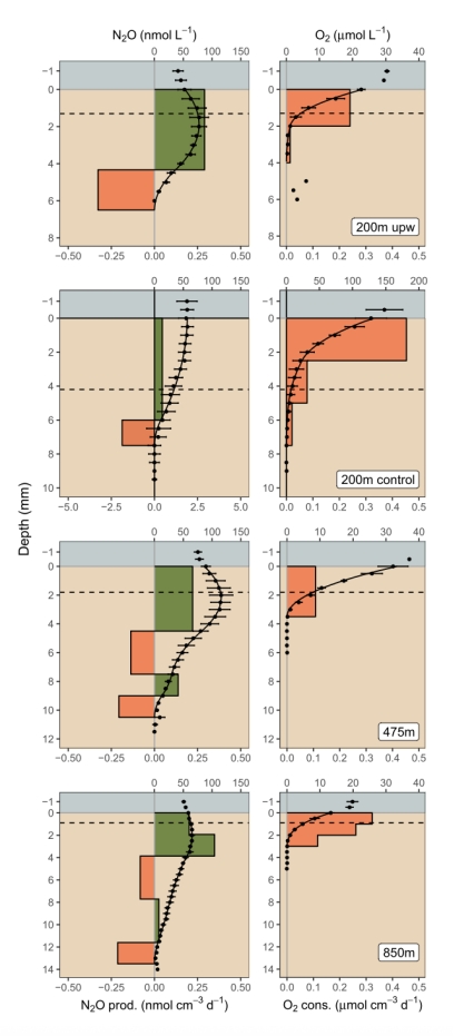 ? 數(shù)據(jù):亞毫米級濃度分布,顯示N?O次表層峰值(最高116 nmol L?1)與O?消耗區(qū)重合。