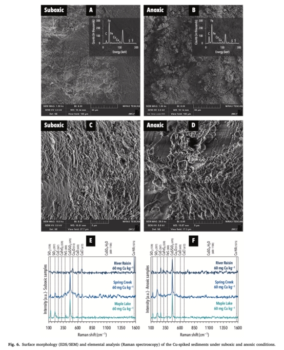 研究通過向三種特性不同的淡水沉積物(密歇根州Spring Creek、River Raisin、Maple Lake)添加30或60 mg kg?1銅(Cu),在氮?dú)猸h(huán)境下培養(yǎng)28天后,添加有機(jī)物(OM)誘導(dǎo)缺氧條件。結(jié)合連續(xù)提取、X射線吸收光譜(EXAFS/XANES)、拉曼光譜、掃描電鏡(SEM/EDS)及毒性測(cè)試(Hyalella azteca和Daphnia magna),揭示Cu在低氧(DO: 1–10 μM)和缺氧(DO<1 μM)條件下的形態(tài)轉(zhuǎn)化與毒性變化。結(jié)果表明:OM添加觸發(fā)缺氧條件使Cu從酸溶態(tài)(F1)轉(zhuǎn)向可氧化態(tài)(F3);EXAFS顯示缺氧沉積物中Cu(I)-硫化物主導(dǎo)(如輝銅礦CuS、黃銅礦CuFeS?),低氧條件下Cu(I)-有機(jī)硫絡(luò)合物占比升高;毒性測(cè)試證實(shí)缺氧條件顯著降低Cu生物毒性。
