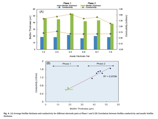 2. 底物依賴性:乙酸饑餓3天(Phase 3)導(dǎo)致K_{\text{bio}}驟降83%至0.24±0.03 mS/cm(圖5),電流密度跌至0.09 A/m2;恢復(fù)供底物后14天,K_{\text{bio}}回升至1.24±0.03 mS/cm(Phase 4)。