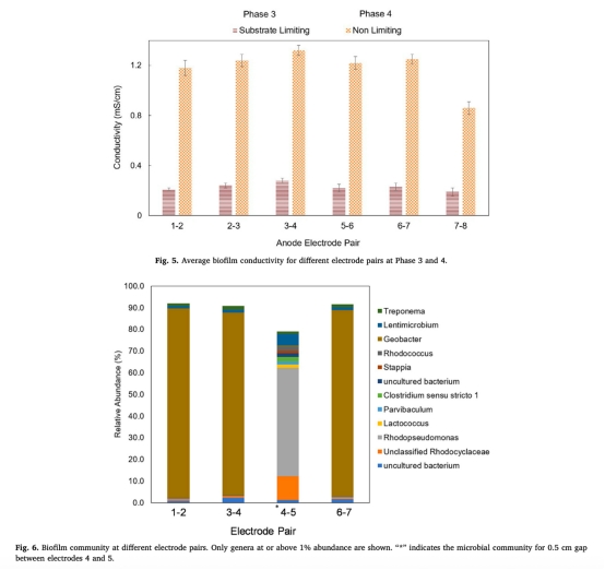 3. 微生物分布:Geobacter在25μm電極間隙區(qū)域占比超85%(圖6),但在0.5 cm寬間隙區(qū)僅占1%,被紅假單胞菌(Rhodopseudomonas sp.,52%)取代,表明長距離電子傳遞存在菌種特異性限制。