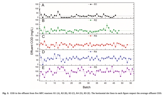 ? 低COD/N(2/1-4/1)提升NH??-N去除(71.9 mg/L)和功率密度(1232 mW/m2),但COD殘留高(98.5 mg/L)且恢復能力差。