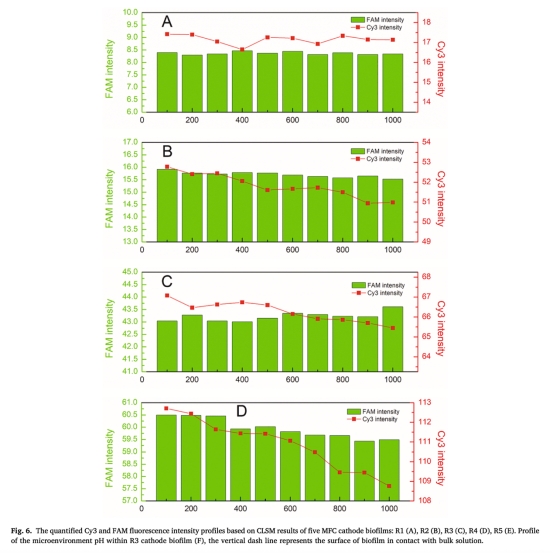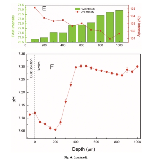 Unisense pH微電極(精度±0.01)用于原位測量陰極生物膜微剖面(圖6F):