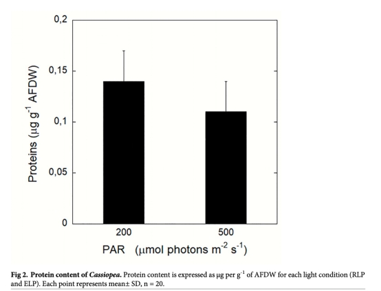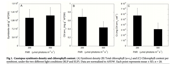 1. 實驗設計:將預適應低光(200 μmol photons m?2 s?1)的水母暴露于高光(500 μmol photons m?2 s?1)一周,模擬從富營養港口向開放水域的過渡。