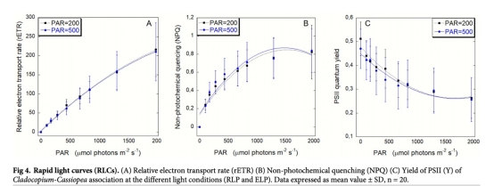 ? 快速光曲線(RLCs):相對電子傳遞速率(rETR)在1956 μmol photons m?2 s?1內未飽和,非光化學淬滅(NPQ)和光系統II量子產額(Y)響應一致(圖4)。