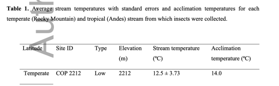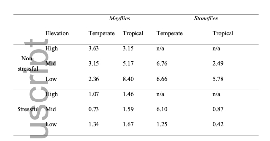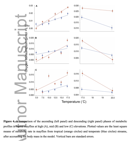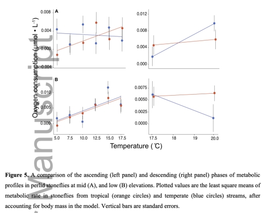 研究通過對比熱帶(厄瓜多爾安第斯山脈)和溫帶(美國落基山脈)不同海拔梯度(約2000米)的蜉蝣(Baetidae科)和石蠅(Perlidae科)標準代謝率(SMR),驗證氣候變異性假說(CVH)。結果顯示熱帶蜉蝣比溫帶蜉蝣對溫度更敏感:其代謝率隨溫度升高更快,且在高溫下更易出現應激行為(如肢體痙攣、死亡)。而熱帶與溫帶石蠅的代謝敏感性無顯著差異。這種差異可能與兩類昆蟲的進化歷史(蜉蝣為熱帶起源,石蠅為溫帶起源)或生態角色(植食性vs捕食性)有關。研究表明低海拔熱帶蜉蝣可能特別易受氣候變暖威脅,并強調熱帶變溫動物的脆弱性需謹慎評估。
