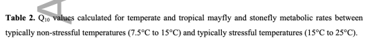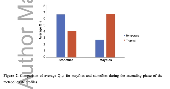 ? 數據:熱帶蜉蝣Q10值更高(非應激溫度下Q10=5.17-8.40),溫帶蜉蝣Q10較低(圖7);石蠅無此趨勢。