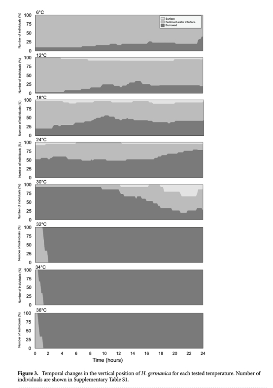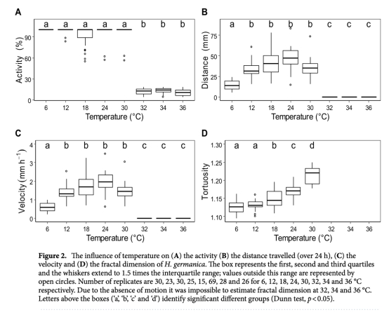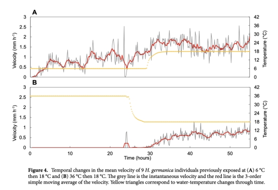 1. 行為響應(yīng):在常規(guī)溫度(6-30°C)下,H. germanica保持高活動(dòng)性(>90%時(shí)間移動(dòng)),速度峰值在24°C(1.74 mm/h);極端高溫(>32°C)導(dǎo)致活動(dòng)驟降(<15%),個(gè)體迅速鉆入沉積物并停止運(yùn)動(dòng),軌跡復(fù)雜度(分形維度)顯著增加至30°C但無(wú)法測(cè)量于32-36°C。