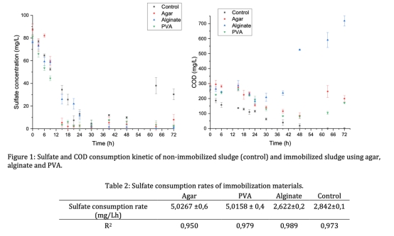 2. 動力學實驗:在厭氧瓶中測試固定化污泥的硫酸鹽還原速率(圖1,表2)和COD去除效率。