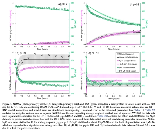 1. 通過動力學實驗(pH 7-10)定量NHCl?分解過程中的關鍵物種(NH?Cl、NHCl?、N?O、DO、NDMA、NO??、NO??)。